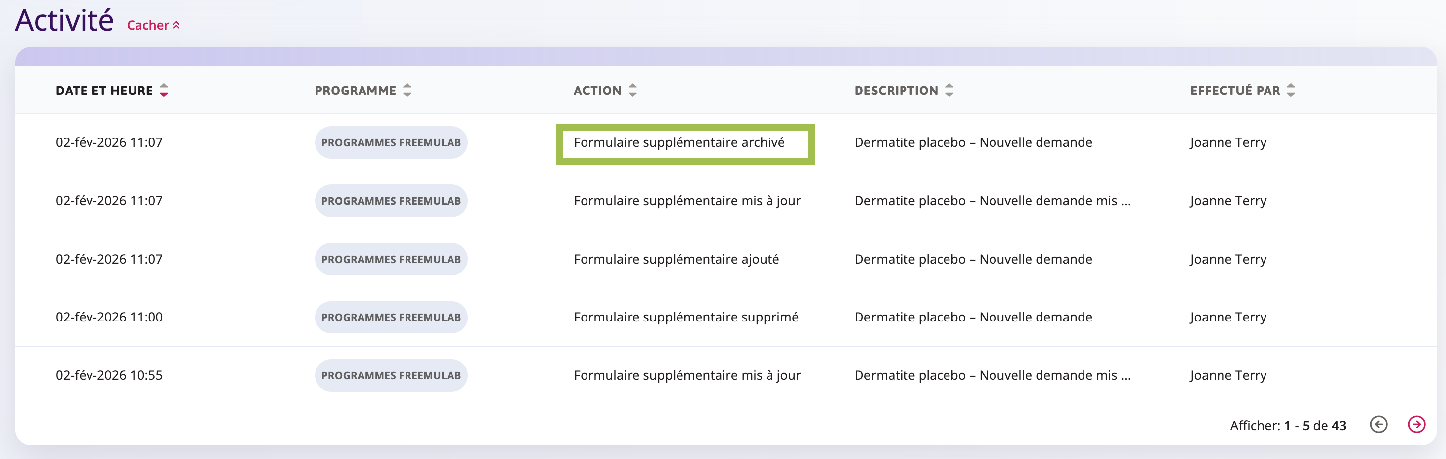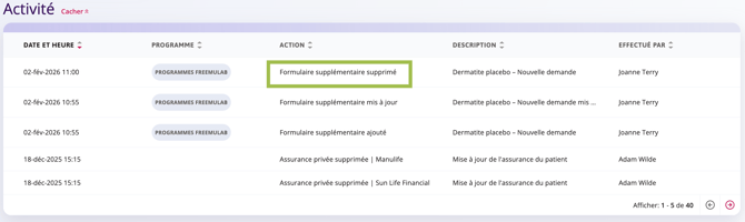 NOTE Une fois le formulaire supprimé, il est toujours possible de vérifier que cette action a bien été effectuée en consultant la section Activité du profil du patient.