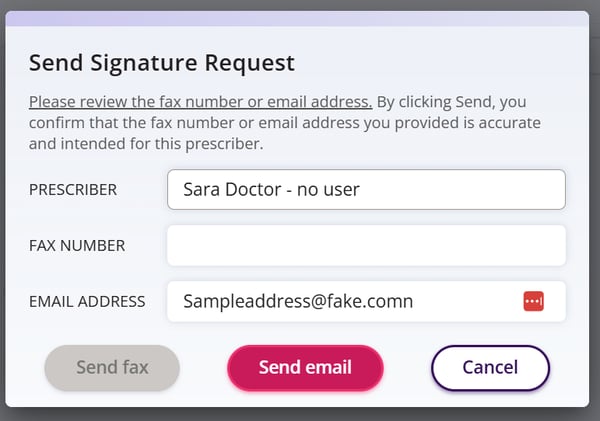 NOTE If you choose to Send for Physician Signature to a non-user prescriber, another dialogue box will display where you can send a notification to request the physician’s signature to a fax number or email address.