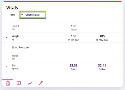(e.g., BMI on the Vitals tile displays green if the patient is within a normal weight range, yellow for overweight or underweight range, and red when the patient is categorized as obese).