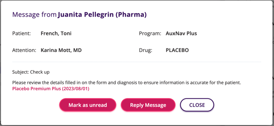 Messages work as a general inbox from the home dashboard, patients overview or program section. You can select a message, reply, mark it as unread or close it.