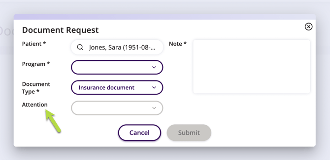 - You will also want to select who you are requesting this document from next to Attention. This field is not required. If you do not choose a user, the Document Request is sent to all Auxita users in the Facility.